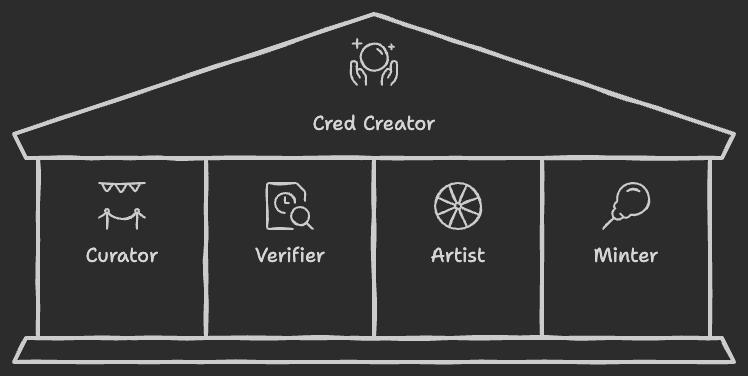Artists help create credential content which can be minted by Minters who want to collect the credentials. Multiple artists and artworks can be created for an onchain credential, which allows various styles of art to be collected.
