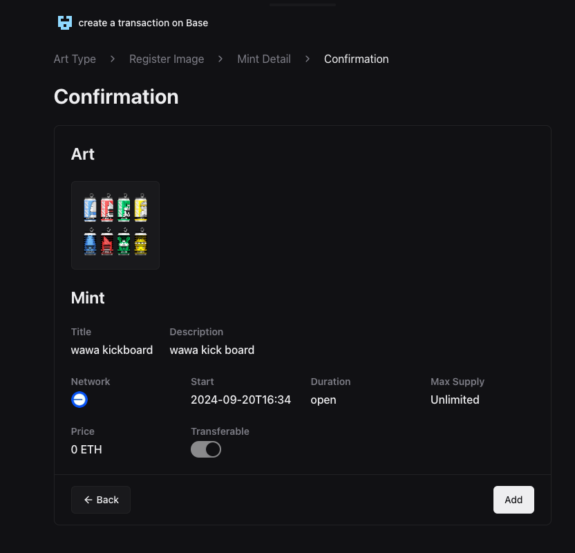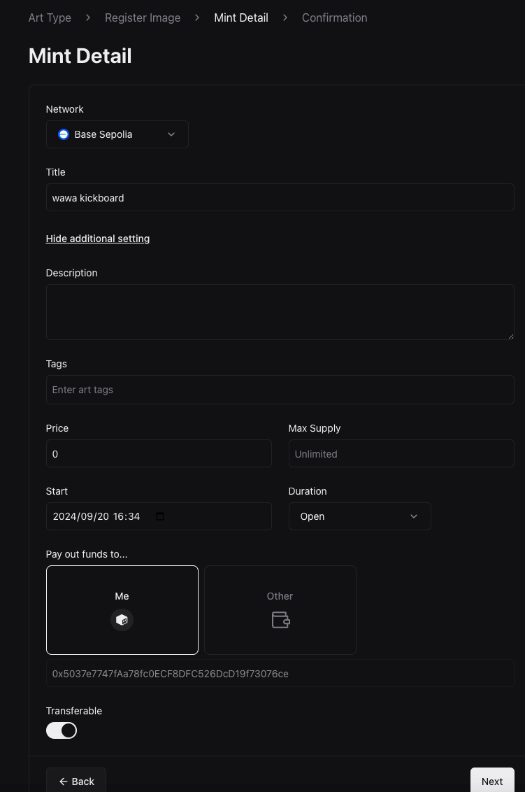 10. **Transferable**: Toggle whether the art is transferable or not.